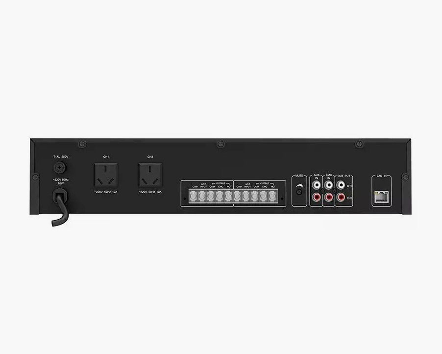 - Підтримка двосторонньої розетки джерела живлення, вбудоване інтелектуальне керування живленням, воно автоматично вимикає вихідне живлення, коли немає BGM музики або дзвінків, і автоматично вмикає джерело вихідного живлення, коли є сигнал.